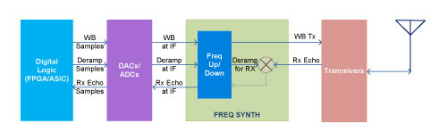 As per Figure 1, FPGA generates digital samples for Wide band and Deramp, Wide band for Radar transmission and Deramp for receiver path signal processing. Most of the systems use external DACs for getting IF analog outputs of FPGA samples, newer FPGA devices are capable of achieving direct RF signal generation with inbuilt high speed DACs.
