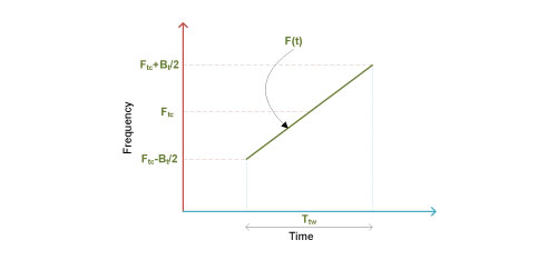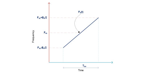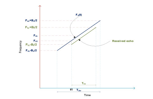 • When an echo signal arrives at the radar receiver, assuming a stationary target, its starting frequency within the pulse shall be exactly same as that of Transmit signal. Soat time instance t1 the frequency of the received signal is (Ftc-Bt/2).